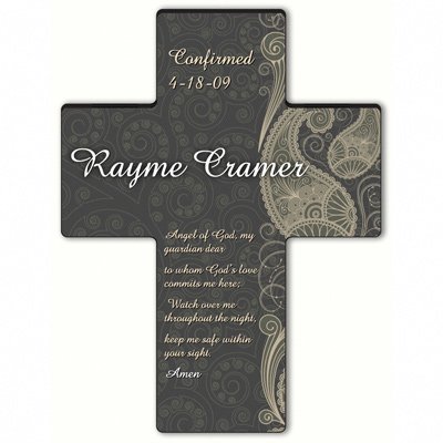 Wedding Favor - Bridal Shower Gift - Baby Shower Keepsake: Celebrate a special religious landmark in the life of a loved one with this handsome grey and white personalized paisley cross. Especially suitable for a boy or young man, this personalized cross features a choice of nine prayers and includes the name of the recipient in a masculine font. Printed on long-lasting composite material. Includes stand for more display options. Stand included. Cross measures 6 3 4 x 5 1 8 x 1 4. Stand measures 1 3 4 in diameter and stands 3 4 tall. Select prayer and personalize with a name of up to 20 characters, an event of up to 15 characters and date MM-DD-YY format. PRAYER TEXT: Angel of God, my guardian dear to whom God?TMs love commits me here; Watch over me throughout the night, keep me safe within your sight. Amen.