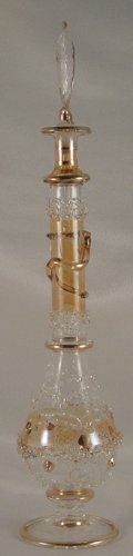 Direct Import from Egypt. ------------ Dating back to 30 B.C., these bottles still grace Pharaoh's tombs in the valley of the kings. Today these functional perfume bottles may be filled with scented oils, bath fragrances, or just represent a beautiful addition to any cherished collections. Egypt has a proud and continuing tradition of glass blowing. Each perfume bottle is a mouth blown masterpiece: hand-etched & hand-painted. Highlighted with 9K Gold, each piece is an incomparable, unique and one of a kind gift. ------------- We carry a wide selection of colors and sizes of these unique Egyptian Perfume Bottles. Treat yourself to this item or give it as a gift.