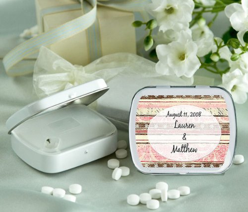 Wedding Favor - Bridal Shower Gift - Baby Shower Keepsake: These elegant hinged mint boxes are finished in an attractive gloss white color and are sure to provide a tasty treat for your guests.The tins are filled mints with a refreshing peppermint flavor a real crowd pleaser.The tins are sealed with a clear wrap around the side of the container.Personalize each mint box with your name, event date and an illustration from our extensive design library.You are sure to find a design that perfectly complements your event theme and style. Mints are sugar free Mint Box Size: 2 3 8 long x nearly 2 wide and 5 8 high Weight: 1.4 ounces. Note: Tag or Sticker does not come attached to item.