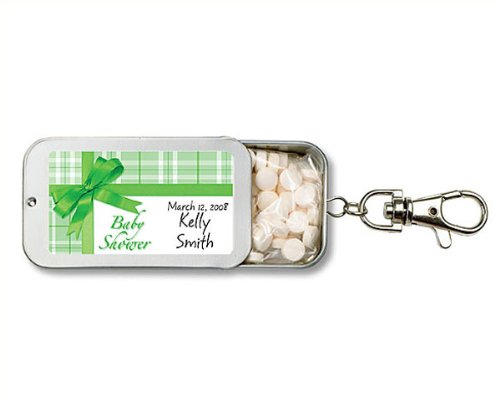 The Detailed Description of Baby Keepsake: Green Gift Wrap Baby Shower Design Personalized Key Chain Mint Tin Fav (Set of 24)