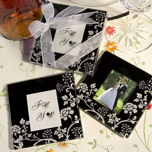 Wedding Favor - Bridal Shower Gift - Baby Shower Keepsake: These distinctive floral design photo coaster sets put an elegant photo finish on your guests` day Now here`s a favor that`s as pretty as a picture. And these lovely coaster sets are sure to develop into a useful addition to each of your guests` homes. Sold only by Fashioncraft, the set contains two square glass coasters. Each measures 3 1 2 x 3 1 2 and has a dramatic black and white floral design with branches, leaves and flowers, bordering a 1 1 2 x 2 photo window. Destined to hold a favorite shot of the day, each set comes packaged in a clear plastic box tied with a white organza bow with a starry For You message showing through.