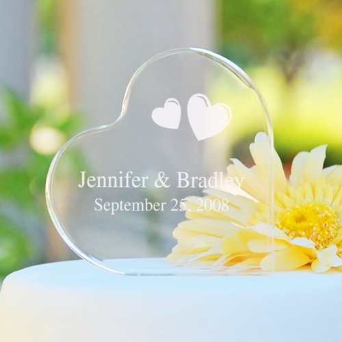 - The Personalized Acrylic Heart Cake Toppers can be engraved with two first names and wedding date (max of 24 characters per line) or an interlocked script monogram at No Additional Cost.