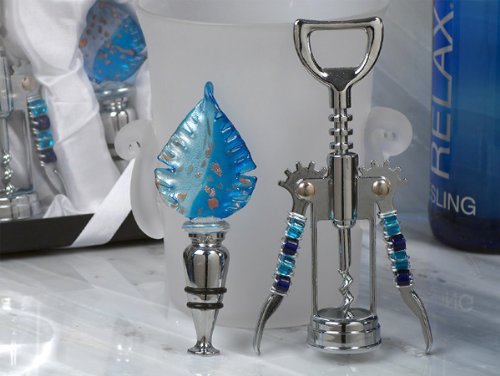 Wedding Favor - Bridal Shower Gift - Baby Shower Keepsake: Two hearts are better than one, and so are these unique combination set Wine opener and wine stopper favors. Dazzle your guests with Cassiani collections exclusive Murano art deco favors. Inspired by the artisans of Murano Italy, these handcrafted wine openers and stoppers are accented with murano like glass that will wow your guests with it's elegance and style. Each set has a wine stopper that has an elegant leaf shaped murano like glass top in stunning blue colors with gold accents with a solid chrome metal base, the solid metal wine opener is accented with perfectly placed blue color beads. Sure to be appreciated by the wine enthusiast in the crowd. They each come packaged in a black bottom gift box set in a stain lining and a clear pvc top for viewing the elegance and finished with a white satin ribbon. Each stopper measures 4.50" in length and the wine opener 6".