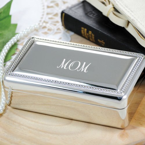 You're mother will surely feel blessed when she receives our Mom's Beaded Silver Jewelry Box from you. No need for a special occasion, this silver-plated keepsake makes an ideal "just because" gift for the women who give more love than most. Elegantly engraved with "Mom" on the lid, this jewelry holder carefully opens to reveal a mirror, draped velvet lining, two individual compartments and padded rolls for holding rings and stud earrings... Tres' chic Details: Size: Measures 5" by 3" by 1 1 2 inches. Materials: Sterling silver-plated setting and velvet ... This unique & elegant item is part of our exclusive Wedding Favor and Bridal - Baby Shower collection. They make for a great and unique gift for your wedding reception, bridal shower, bay shower or any other special event.