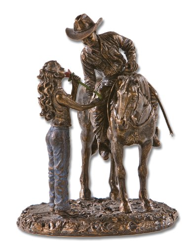 Cherished Cake Topper is a small bronze colored resin sculpture of a charming cowboy leaning over from his horse to hand his girl a rose. Size approximately W 5.5 inches X H 7 inches. Resin. Import. Please Note - Due to new UPS shipping rules and the size of the box, if you choose to expedite your statue order (UPS 3-day, 2-day or Overnight), an additional non-refundable $20 shipping charge per statue will be added at the time your order is processed.