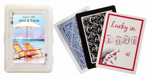 These exclusive design, premium, playing cards are a sure bet to put a smile on your guests faces. Our cards are packaged in a practical, translucent gift box that makes for a pretty presentation for your guests. Choose a design from our extensive design library and personalize the box cards are not personalized with 2-3 lines of text to include your names, event date and if you wish a fun phrase e.g., Perfect Pair, Two of a Kind. etc. Dimensions: Decks measure 2 3 4 x 4 in. Weight: 0.35 lbs each. Note: Tag or Sticker does not come attached to item. ... This unique & elegant item is part of our exclusive Wedding Favor and Bridal - Baby Shower collection. They make for a great and unique gift for your wedding reception, bridal shower, bay shower or any other special event.