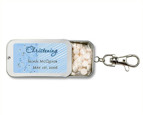 This beautifully designed keychain mint tin makes the perfect favor ?" these flavorful mints are sure to leave your guests with fond memories of your event. The refreshing mints are packaged in a brushed tin container with a fun and practical key chain attachment along with a tin top that slides open to provide ready access to the mints.Further personalize your gifts with your names and event date along with your choice of one of our premium designs from our extensive design library. You are sure to find a design that perfectly complements your event theme and style. Measurements: 2.75 L x 1.5 W x 0.5 H Flavor: Cool Peppermint, Cinnamint, Refreshing Green Tea. Note: Tag or Sticker does not come attached to item. ... This unique & elegant item is part of our exclusive Wedding Favor and Bridal - Baby Shower collection. They make for a great and unique gift for your wedding reception, bridal shower, bay shower or any other special event.