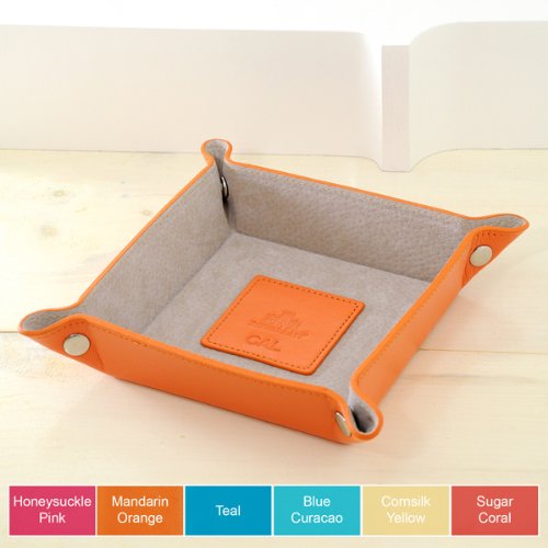 Wedding Favor - Bridal Shower Gift - Baby Shower Keepsake: Our Personalized Leather Trinket and Coin Tray is our cutest catch-all to date Fashioned in soft fine leather and accented with a neutral micro-suede interior, this handy accessory is designed for the savvy traveler, unsnapped the tray packs flat, and then snaps back together with ease to hold jewelry, keys, coins, cards and phones. Not a jet-setter? There`s no need to worry, this tray works famously for home and office organization as well. Available in Honeysuckle Pink P, Mandarin Orange OR, Teal T, Blue Curacao B, Cornsilk Yellow Y and Sugar Coral C. Details: Size: Measures 8 by 8 by 1.5 inches. Materials: LeatherPersonalization Options: The Personalized Leather Trinket and Coin Tray may be debossed with up to three block initials on the center tag at No Additional Cost.