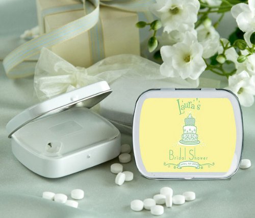 Wedding Favor - Bridal Shower Gift - Baby Shower Keepsake: These elegant hinged mint boxes are finished in an attractive gloss white color and are sure to provide a tasty treat for your guests.The tins are filled mints with a refreshing peppermint flavor a real crowd pleaser.The tins are sealed with a clear wrap around the side of the container.Personalize each mint box with your name, event date and an illustration from our extensive design library.You are sure to find a design that perfectly complements your event theme and style. Mints are sugar free Mint Box Size: 2 3 8 long x nearly 2 wide and 5 8 high Weight: 1.4 ounces. Note: Tag or Sticker does not come attached to item.