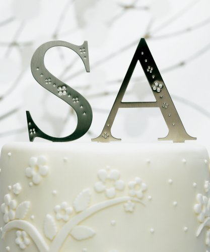 - Brushed silver monograms with crystals give an elegant finish to your cake.