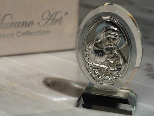 Wedding Favor - Bridal Shower Gift - Baby Shower Keepsake: A religious work of art, These solid Crystal Icons are the perfect favors for any religious themed event. Whether a communion, christening, or even religious themed wedding, these favors will impress your guests. Made of solid quality crystal these oval Glass icons have a two tone Italian like silver Madonna and child decoration attached to solid crystal base. They come elegantly packaged in our signature two piece white gift box with pillow soft satin lining and stamped with authentic Murano art deco collection in silver foil. They measure 2.75in. x 1.75in.