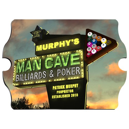 Wedding Favor - Bridal Shower Gift - Baby Shower Keepsake: If your man enjoys hanging with his buds in that special room that off limits to the ladies, he'll go wild over this personalized Man Cave sign This pool-themed sign boasts a 1950s vintage Vegas feel and makes the perfect wall hanging for his private lair. Grrrr Measures 10 3 4" x 15 1 2" x 1 4". Personalize with first and last names and established year.