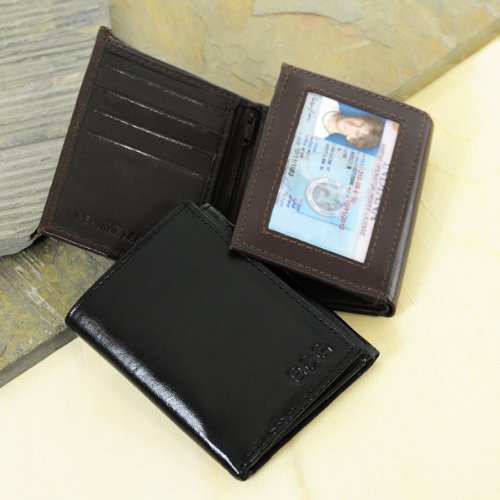 Wedding Favor - Bridal Shower Gift - Baby Shower Keepsake: A must have for every man, our Oxford Tri-fold Genuine Leather Wallet is both masculine and refined. Fashioned in 100% lambskin leather, this multi-purpose wallet features dually slit money compartments, 9 easy to access card slots, a zippered centered section for securing important items and a picture window perfect for storing an ID or a driver's license. Because of its smart look and functional purpose, this custom leather wallet is easily a timeless accessory he'll treasure for years Available in Black BK and Brown BN. Details: Size: Measures 3 by 4 by 1 inch deep closed and 9 by 4 inches open. Materials: Genuine lambskin leatherPersonalization Options: The Kensington Tri-fold Genuine Leather Wallet may be debossed with up to three block initials at No Additional Cost.