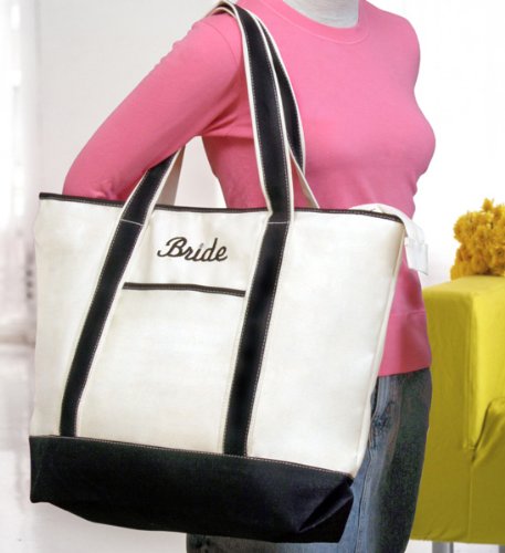 Our Bride's Planning Tote is the sure fire way to stand out and stay organized while planning your big day This trendy canvas tote with dual interior and exterior pockets is large enough to hold all your belongings while still remaining small enough to navigate through a day of hustle and bustle. From magazines and planners to fabric swatches and phone numbers, you will always be prepared. After the wedding, take this tote on your honeymoon to let everyone know who the bride is Details: Size: Measures 22" by 16" by 6 inches. Materials: Cotton canvas Embroidery Options: The Bride's Planning Tote is embroidered with a script "Bride" in black thread with Swarovski crystal accent dotting the "i." ... This unique & elegant item is part of our exclusive Wedding Favor and Bridal - Baby Shower collection. They make for a great and unique gift for your wedding reception, bridal shower, bay shower or any other special event.