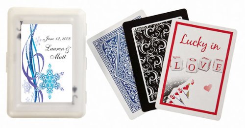 These exclusive design, premium, playing cards are a sure bet to put a smile on your guests faces. Our cards are packaged in a practical, translucent gift box that makes for a pretty presentation for your guests. Choose a design from our extensive design library and personalize the box cards are not personalized with 2-3 lines of text to include your names, event date and if you wish a fun phrase e.g., Perfect Pair, Two of a Kind. etc. Dimensions: Decks measure 2 3 4 x 4 in. Weight: 0.35 lbs each. Note: Tag or Sticker does not come attached to item. ... This unique & elegant item is part of our exclusive Wedding Favor and Bridal - Baby Shower collection. They make for a great and unique gift for your wedding reception, bridal shower, bay shower or any other special event.