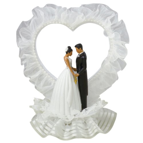 A heart arch trimmed with lush chiffon ruffle and pearl accents frame this gorgeous Ty Wilson couple figurine. Layers of ruffles completes the base of this cake top. Cake top is 9-Inch tall. Available in white and ivory.