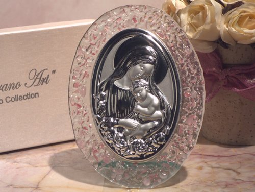 Wedding Favor - Bridal Shower Gift - Baby Shower Keepsake: Inspired by the artisans of Murano Italy, these handcrafted Murano like glass Icons are stunning and will wow your guests with it's elegance and style. From Cassiani collections exclusive Murano art deco collection this unique creation is a handmade Venetian like oval shape glass icon . These handmade favors are more like a religious work of art that it is sure to leave a lasting impression of your special day with your guests. Each of these fabulous art deco icons are handmade oval shaped glass with a two tone silver icon of Madonna and child decoration, the glass has an elegant mixture of unique pink pebble design, they are truly unique and no two are exactly alike. They come packaged in high quality two piece elegant white gift box set in a soft satin lining and it is stamped with our authentic Murano art deco collection in silver foil. Each Icon measure approximately 3.25 x 4.75.