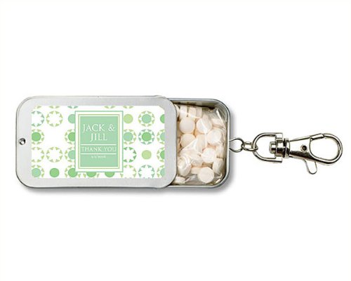 This beautifully designed keychain mint tin makes the perfect favor ?" these flavorful mints are sure to leave your guests with fond memories of your event. The refreshing mints are packaged in a brushed tin container with a fun and practical key chain attachment along with a tin top that slides open to provide ready access to the mints.Further personalize your gifts with your names and event date along with your choice of one of our premium designs from our extensive design library. You are sure to find a design that perfectly complements your event theme and style. Measurements: 2.75 L x 1.5 W x 0.5 H Flavor: Cool Peppermint, Cinnamint, Refreshing Green Tea. Note: Tag or Sticker does not come attached to item. ... This unique & elegant item is part of our exclusive Wedding Favor and Bridal - Baby Shower collection. They make for a great and unique gift for your wedding reception, bridal shower, bay shower or any other special event.