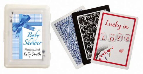 These exclusive design, premium, playing cards are a sure bet to put a smile on your guests faces. Our cards are packaged in a practical, translucent gift box that makes for a pretty presentation for your guests. Choose a design from our extensive design library and personalize the box cards are not personalized with 2-3 lines of text to include your names, event date and if you wish a fun phrase e.g., Perfect Pair, Two of a Kind. etc. Dimensions: Decks measure 2 3 4 x 4 in. Weight: 0.35 lbs each. Note: Tag or Sticker does not come attached to item. ... This unique & elegant item is part of our exclusive Wedding Favor and Bridal - Baby Shower collection. They make for a great and unique gift for your wedding reception, bridal shower, bay shower or any other special event.