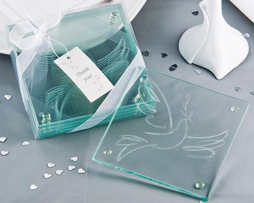 Wedding Favor - Bridal Shower Gift - Baby Shower Keepsake: White Dove' Glass Coaster Set of 4The 'White Dove' Glass Coaster is as meaningful as it is elegant. What better way to thank your guests than to offer them a keepsake gift of peace and well wishes? The flowing design of the dove on this quality glass coaster will be a keepsake gift guests will treasure. Rooted in Christianity, the Dove makes symbolic reference to the Holy Spirit and the White Dove references peace. Ideal party favors for weddings, bridal showers, baby showers and religious themed events these favors will bring both elegance and warmth to your special event. Packaged with 4 coasters per favor, this makes for a truly substantial bomboniere or party favor. Also includes Thank You favor tag. Each coaster has non-slip 'feet' to ensure surface protection.Made from glass. Packaged dimensions approx. 4 x 4 x 0.9 10 x 10 x 2.25 cm.