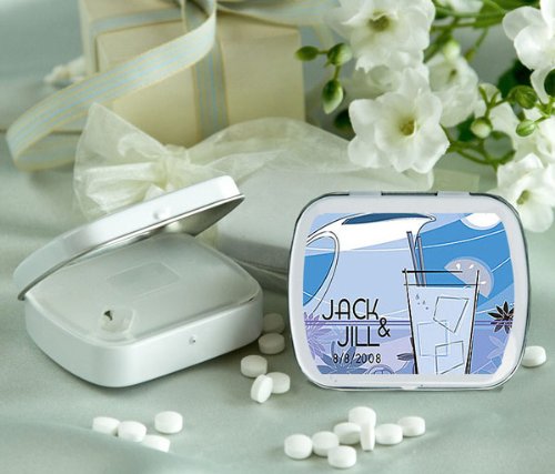 Wedding Favor - Bridal Shower Gift - Baby Shower Keepsake: These elegant hinged mint boxes are finished in an attractive gloss white color and are sure to provide a tasty treat for your guests.The tins are filled mints with a refreshing peppermint flavor a real crowd pleaser.The tins are sealed with a clear wrap around the side of the container.Personalize each mint box with your name, event date and an illustration from our extensive design library.You are sure to find a design that perfectly complements your event theme and style. Mints are sugar free Mint Box Size: 2 3 8 long x nearly 2 wide and 5 8 high Weight: 1.4 ounces. Note: Tag or Sticker does not come attached to item.
