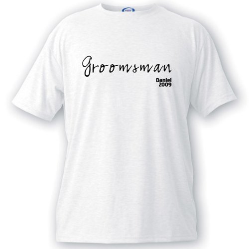Wedding Favor - Bridal Shower Gift - Baby Shower Keepsake: Our classiest wedding t-shirts boast handsome script titles for each member of the bridal party. Each personalized white tee also includes the name of the recipient and year of the event, printed in easy-to-read block letters. The performance t-shirt is made of a light and durable micro-fiber and spun poly fabric for extra comfort and sturdiness. Personalize it with Name, Year and Location.