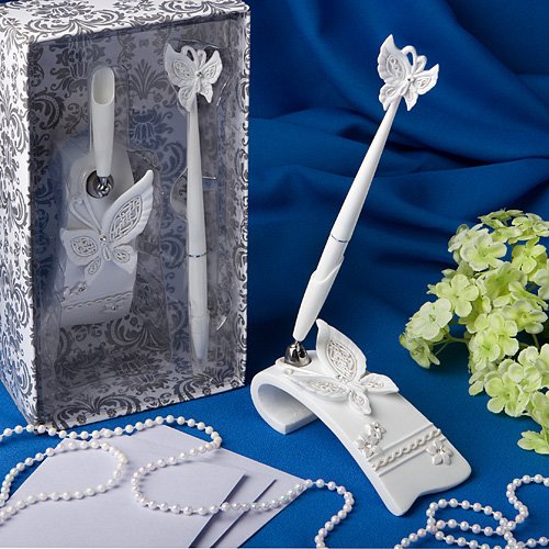 Wedding Favor - Bridal Shower Gift - Baby Shower Keepsake: This butterfly design wedding pen set from Fashioncraft`s Finishing Touches Collection is a wedding day accessory that`s worth writing home about Give your guests the opportunity to write down their well wishes in style when they sign your guest book with this perfect pen. Ideal as an accessory for a butterfly themed wedding or to add elegance to any wedding celebration, each butterfly design wedding pen set from Fashioncraft`s Finishing Touches Collection of wedding accessories measures 8 high with the pen inserted ?" 4 high without the pen - in a 1 1 2 base. The curved strip shaped base is made of white poly resin with detailed butterfly and design carvings, with a metal and plastic holder for the white ball point pen. Each elegant pen set comes delightfully packaged in a clear topped box with a slate gray and white damask design base for storage after your wedding day is through
