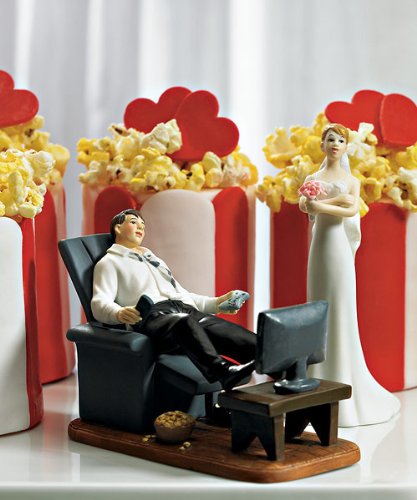 Wedding Favor - Bridal Shower Gift - Baby Shower Keepsake: Whether the ultimate couch potato, a gamer at heart, or a guy that just can't part with his remote control, reflect his true personality with this totally unique topper. Even he will have to laugh at himself Hand painted porcelain. The Exasperated Bride Mix and Match Cake Topper shown is sold separately. Presently the Bride and Groom Cake Toppers are available with skin tones and hair colors only as shown. Measurements: 5.25" Long, 4" Tall, Weight: 12 oz - 0.75 lb. , Base: 5-1 8" x 2-1 2"