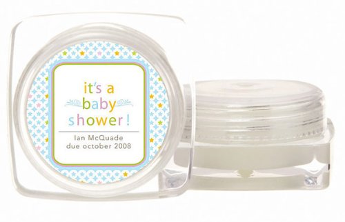 The Detailed Description of Baby Keepsake: Blue Stars Design Baby Shower Personalized Large Lip Balm Pot with SPF (Set of 24)