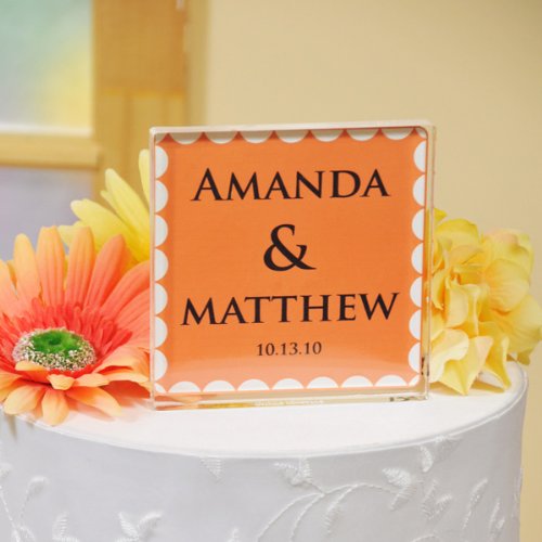 Your cake will look great when it's decorated with our Blossom Wedding Cake Topper Ideally sized and personalized free of charge, this one of a kind cake top comes to life in one of today's most sought after wedding colors and your names and date So, place it on top for all to see, because everyone knows that this must have takes the cake Details: Size: Measures 4 inches by 4 inches by 1 2 inch thick. Materials: Acrylic and static cling vinylPersonalization Options: The Blossom Wedding Cake Topper may be personalized with two block first names max of 12 characters per name and wedding date with your choice of a cloud, aqua, sage, wisteria, petal pink, raspberry, wineberry, plum, claret, tangerine, chocolate, grey, black, burnt sienna, cinnamon, blueberry or ice blue background at No Additional Cost. *Please Note: Personalization ink varies with background color. ... This unique & elegant item is part of our exclusive Wedding Favor and Bridal - Baby Shower collection. They make for a great and unique gift for your wedding reception, bridal shower, bay shower or any other special event.