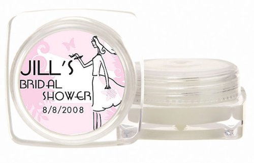 The Detailed Description of Baby Keepsake: Pink Bridal Theme Personalized Large Lip Balm Pot with SPF15 Protectio (Set of 24)