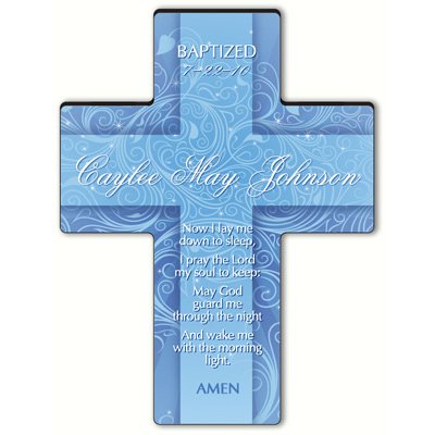 Wedding Favor - Bridal Shower Gift - Baby Shower Keepsake: Decorated with delicate swirls and sparkling bursts of light, our personalized Twinkling Star Cross is the ideal addition to a nursery or young person?TMs room. Made of a long-lasting composite material, this pretty cross will be a long-treasured gift. Choose from nine poems of faith suitable for a variety of occasions. Stand included. Cross measures 6 3 4 x 5 1 8 x 1 4. Stand measures 1 3 4 in diameter and stands 3 4 tall. Select prayer and personalize with a name of up to 20 characters, an event of up to 15 characters and date MM-DD-YY format. PRAYER TEXT: Now I lay me down to sleep, I pray the Lord my soul to keep. May God guard me through the night and wake me with the morning light. Amen.