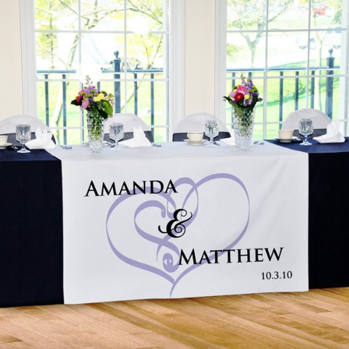 Wedding Favor - Bridal Shower Gift - Baby Shower Keepsake: Show off your love and impeccable taste with our Embracing Hearts Table Runner. With its large size and whimsical design " accented with your names and wedding date inside two interlocking hearts " this unique reception accessory will easily add a pop of stylish flare to every wedding day it decorates. From ball room extravaganzas to backyard barbeques, receptions of any kind will all look a little bit better with your names as the crowning jewelAnd because each one is available in a variety of today's hottest wedding colors and personalized free of charge, this crisp white table cloth provides an ideal canvas for the trendy, DIY bride to get really creative Instructions for use included. Details: Size: Measures 54 inches wide by 72 inches long. Materials: 100% Printable PolyesterPersonalization Options: The Embracing Hearts Table Runner may be personalized with two block first names max of 12 characters per name and numeric date printed in black with your choice of cloud, aqua, sage, wisteria, petal pink, raspberry, wineberry, plum, claret, tangerine, chocolate, grey, black, burnt sienna, cinnamon, blueberry or ice blue accents at No Additional Cost.