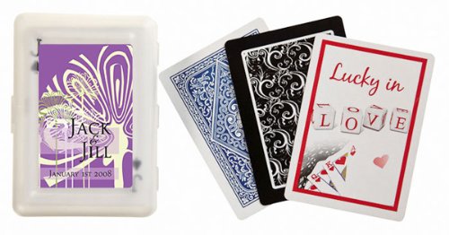 These exclusive design, premium, playing cards are a sure bet to put a smile on your guests faces. Our cards are packaged in a practical, translucent gift box that makes for a pretty presentation for your guests. Choose a design from our extensive design library and personalize the box cards are not personalized with 2-3 lines of text to include your names, event date and if you wish a fun phrase e.g., Perfect Pair, Two of a Kind. etc. Dimensions: Decks measure 2 3 4 x 4 in. Weight: 0.35 lbs each. Note: Tag or Sticker does not come attached to item. ... This unique & elegant item is part of our exclusive Wedding Favor and Bridal - Baby Shower collection. They make for a great and unique gift for your wedding reception, bridal shower, bay shower or any other special event.