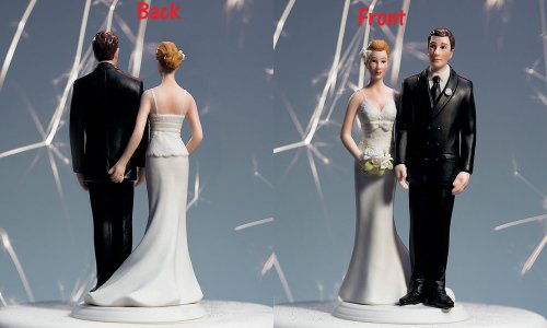 Life is all about the little moments. Particularly those that no one knows about but you. This elegant couple takes romance - and fireworks - to a new level. Poised and elegant from the front, the back reveals a hidden little pinch - and a few extra "sparks". Hand painted porcelain. Available in Caucasian and Ethnic. Presently the Bride and Groom Cake Toppers are available with skin tones and hair colors only as shown.the love pinch couple wedding cake topper