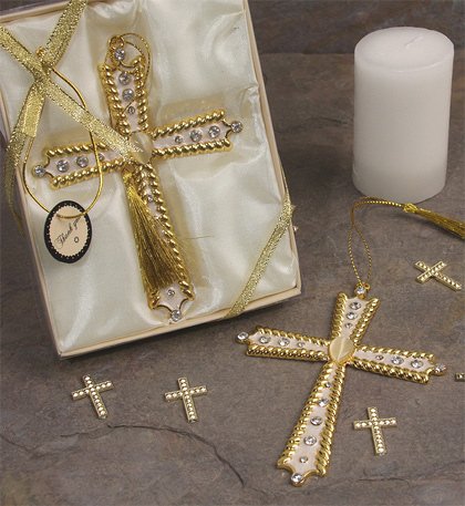 Wedding Favor - Bridal Shower Gift - Baby Shower Keepsake: Cherish your blessed event with this decorated gold tone hanging cross. Perfect for any special religious occasion such as a baptism, communion, or confirmation. Metal cross is coated with an ivory enamel top and painted in gold tones, inlayed crystals and a large center pearl finish off the look of this decorative cross . Matching gold tone tassel included to hang your cross and enjoy its beauty. Comes in an elegant ivory satin lined box with a see through cover, a matching bow and thank you tag. From the Lorren Home Collection. Cross measures 3.5" x 5"