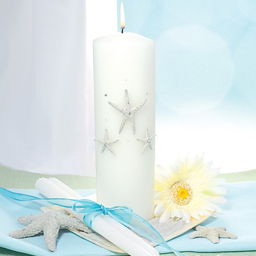 Wedding Favor - Bridal Shower Gift - Baby Shower Keepsake: The Beach Unity Candle and Taper Set is the perfect accessory to compliment your tropical wedding celebration. The pillar candle is adorned with delicate starfish, each embellished with diamond dust and Swarovski crystals arranged by hand to create a sparkling sensation. Set includes a single, pillar candle and two tapers. Available in White W and Ivory I. Details: Size: Unity Candle measures 3 by 9 inches. Tapers measure 10 inches tall. Materials: Candle wax, starfish, Swarovski crystals and diamond dust. *Please Note: Ivory tapers may have slight color variations due to the dye process.