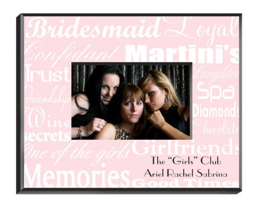 Thank her for being part of your special day with this bridesmaid picture frame that says it all Fashioned in traditional black and white or pretty pink and white or one of our trendy color combinations with text that helps recall those special girl moments, our personalized bridesmaid frame is an ideal bridal party gift and a perfect place for that unforgettable bridesmaid photo. Frame measures 8 x 10 and holds a 4 x 6 picture. Be creative and personalize the two lines in the lower right hand corner especially for your bridesmaids. Each line can be personalized with up 20 characters per line. ... This unique & elegant item is part of our exclusive Wedding Favor and Bridal - Baby Shower collection. They make for a great and unique gift for your wedding reception, bridal shower, bay shower or any other special event.