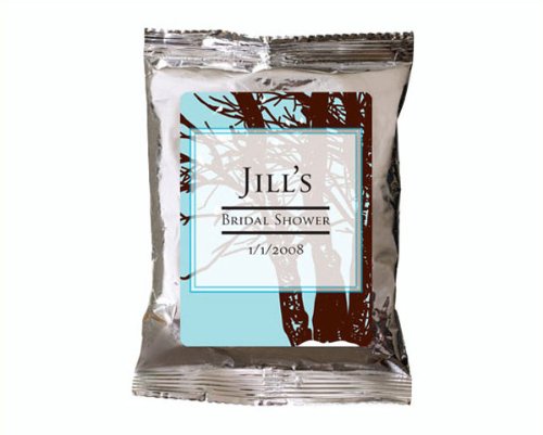 This frothy, iced cappuccino drink is sure to be a rich and refreshing guest pleaser. The single serving pouches are sealed in elegant silver pouches which can be personalized with your names and event date along with your choice of one of our premium designs from our extensive design library. You are sure to find a design that perfectly complements your event theme and style. Package Contents: single serving 1 oz package of cappuccino powder Package Size: 4 wide x 6.5 tall Instructions: Just add milk or water and pour over ice. Note: Tag or Sticker does not come attached to item. ... This unique & elegant item is part of our exclusive Wedding Favor and Bridal - Baby Shower collection. They make for a great and unique gift for your wedding reception, bridal shower, bay shower or any other special event.