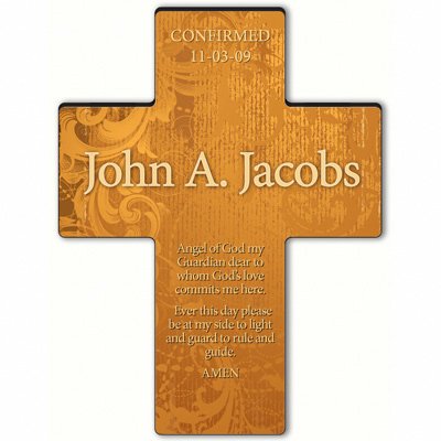 Celebrate God?TMs grace with this elegant gold-toned personalized cross, decorated with flowers and swirls and one of nine prayers, suitable for a variety of religious occasions, including baptism, Holy Communion, confirmation, or marriage. A lovely addition to any room, our Gardens of Grace personalized cross includes the name of the recipient, printed on a long-lasting composite material. Stand included. Cross measures 6 3 4 x 5 1 8 x 1 4. Stand measures 1 3 4 in diameter and stands 3 4 tall. Select prayer and personalize with a name of up to 20 characters, an event of up to 15 characters and date MM-DD-YY format. PRAYER TEXT: Angel of God my Guardian dear to whom God?TMs love commits me here. Ever this day please be at my side to light and guard to rule and guide. Amen. ... This unique & elegant item is part of our exclusive Wedding Favor and Bridal - Baby Shower collection. They make for a great and unique gift for your wedding reception, bridal shower, bay shower or any other special event.