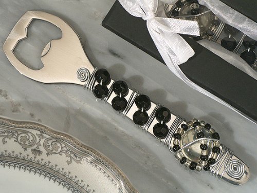 Wedding Favor - Bridal Shower Gift - Baby Shower Keepsake: Dazzle your guests with these handcrafted Murano like glass accented bottle openers, these favors are stunning and will wow your guests with it's elegance and style. From Cassiani collections exclusive Murano art deco collection this uniquely designed bottle opener is made of high quality stainless steel and the handle is accented with dramatic black and clear beaded glass . These handmade favors are more like a work of art that it is sure to leave a lasting impression of your special day with your guests. Each of these fabulous art deco favors are handmade glass, they are truly unique and no two are exactly alike. They come packaged in two piece black window gift box and set in a pillow soft satin lining ready for gift giving and finished with a white satin ribbon. Each opener measures approximately 6" in length.
