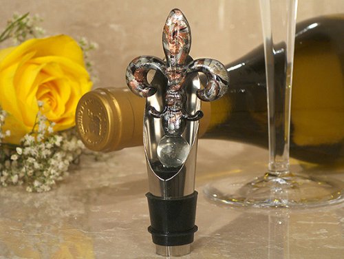 Wedding Favor - Bridal Shower Gift - Baby Shower Keepsake: Inspired by the artisans of Murano Italy, these handcrafted Murano like glass Fleur de lis design wine pourer-stoppers are stunning and will wow your guests with it's elegance and style. From Cassiani collections exclusive Murano art deco collection this unique handmade Venetian like glass Fleur de lis design wine topper is attached to solid rubber stopper and sits on a chrome metal wine pourer . This is a multi functional favor, a combination wine pourer - stopper that has an elegant design Fleur de lis glass top accented in a spectacular array of gold, silver and black colors . Each of these unique art deco favors are handmade and because of that no two are exactly alike. They come elegantly packaged in our signature two piece white gift box with soft satin lining and stamped with authentic Murano art deco collection in silver foil. Each stopper measure approximately 3.5" in length.