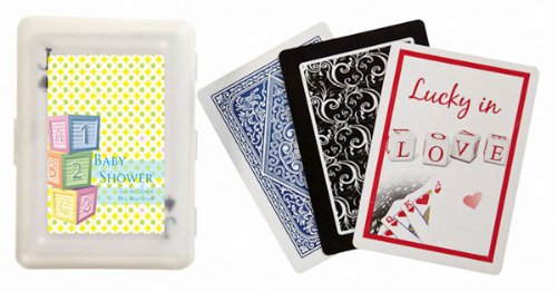 These exclusive design, premium, playing cards are a sure bet to put a smile on your guests faces. Our cards are packaged in a practical, translucent gift box that makes for a pretty presentation for your guests. Choose a design from our extensive design library and personalize the box cards are not personalized with 2-3 lines of text to include your names, event date and if you wish a fun phrase e.g., Perfect Pair, Two of a Kind. etc. Dimensions: Decks measure 2 3 4 x 4 in. Weight: 0.35 lbs each. Note: Tag or Sticker does not come attached to item. ... This unique & elegant item is part of our exclusive Wedding Favor and Bridal - Baby Shower collection. They make for a great and unique gift for your wedding reception, bridal shower, bay shower or any other special event.