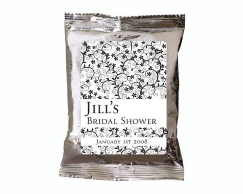 This frothy, iced cappuccino drink is sure to be a rich and refreshing guest pleaser. The single serving pouches are sealed in elegant silver pouches which can be personalized with your names and event date along with your choice of one of our premium designs from our extensive design library. You are sure to find a design that perfectly complements your event theme and style. Package Contents: single serving 1 oz package of cappuccino powder Package Size: 4 wide x 6.5 tall Instructions: Just add milk or water and pour over ice. Note: Tag or Sticker does not come attached to item. ... This unique & elegant item is part of our exclusive Wedding Favor and Bridal - Baby Shower collection. They make for a great and unique gift for your wedding reception, bridal shower, bay shower or any other special event.